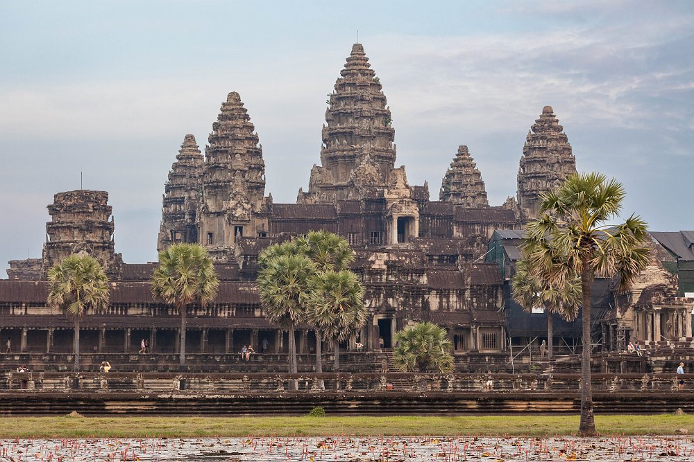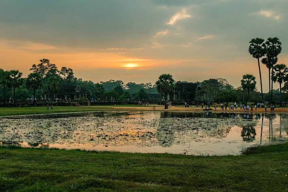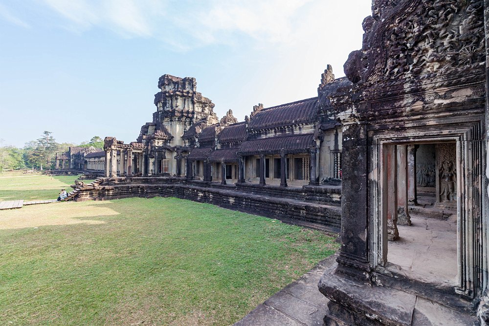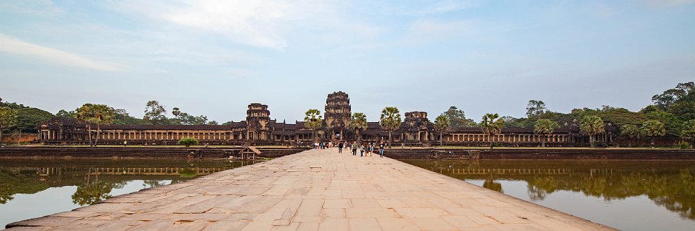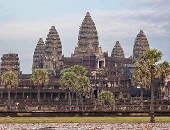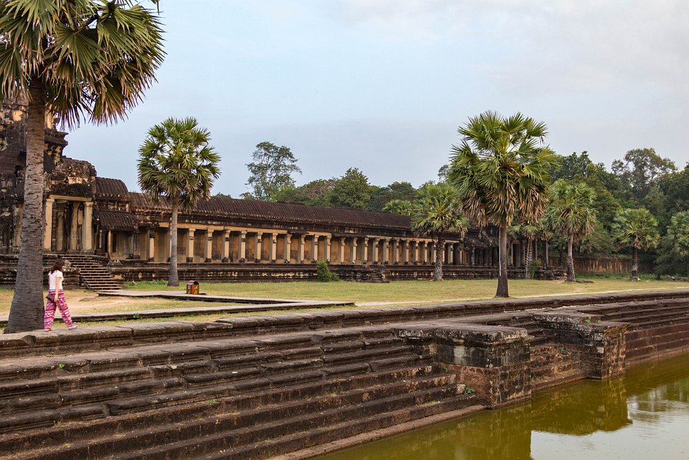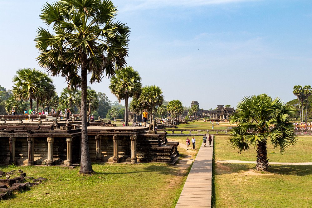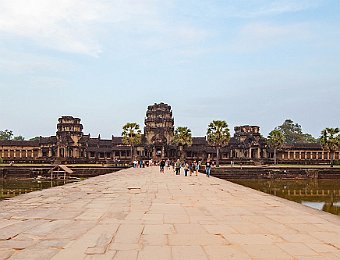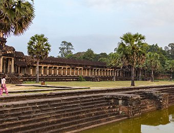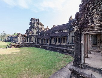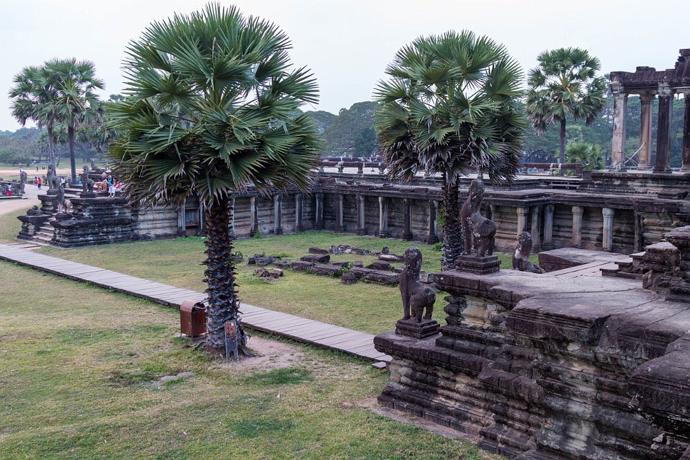 Sandstone causeway across the moat leading to the west Gopura of the outer (fourth) enclosureThe fourth enclosure and steps leading down to the moatAngkor Wat at dawnPart of the cruciform terrace at the end of the west raised walkwayAnother view of the cruciform terrace with the guarding lions and naga balustradesThe five prasats and reflection on the Southern poolThe five prasats are designed to symbolise Mount Meru (a golden mountain that stands in the centre of the universe in Hindu mythology)The tall molded base of the outer enclosure wall is guarded by 2m tall lion statuesThe third gallery, which surrounds the first of the three levels on which Angkor Wat standsThe third gallery of the temple complex Angkor ThomBanteay Kdei