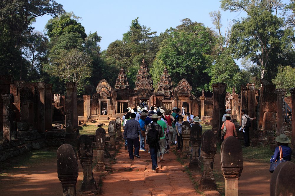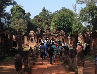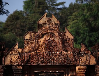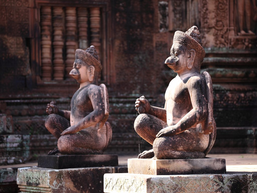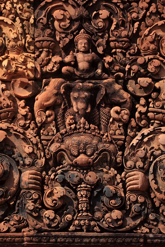 East gopura of Banteay Srei (citadel of women) and the reservoirs surrounding the templeCloser view of the east gopuraTympanum of the east gopura of Banteay SreiDetail of the carvings of the east gopuraProcessional avenue leading to the gopura of the second enclosure wallEast gapura of the second enclosure wallTympanum of the second enclosure wall's gopuraThe incarnation of Vishnu is in the act of disemboweling the demon HiranyakashipuThe first enclosureThe two libraries Banteay KdeiBayon