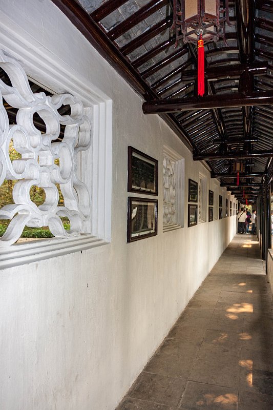 A long covered corridor with lattice windows separates the eastern and central sections of the garden.