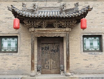 A typical front entrance to a house, guarded by a pair of stone lions.