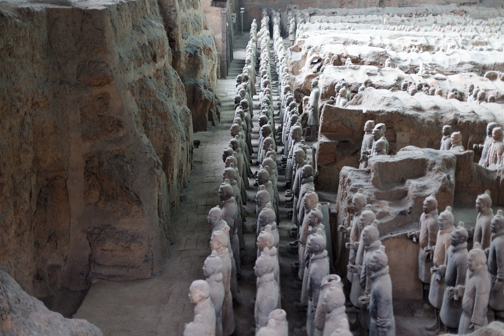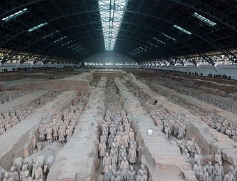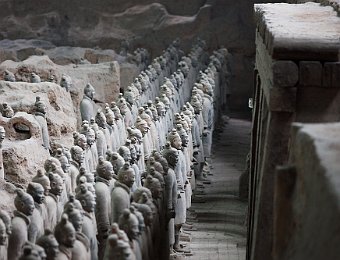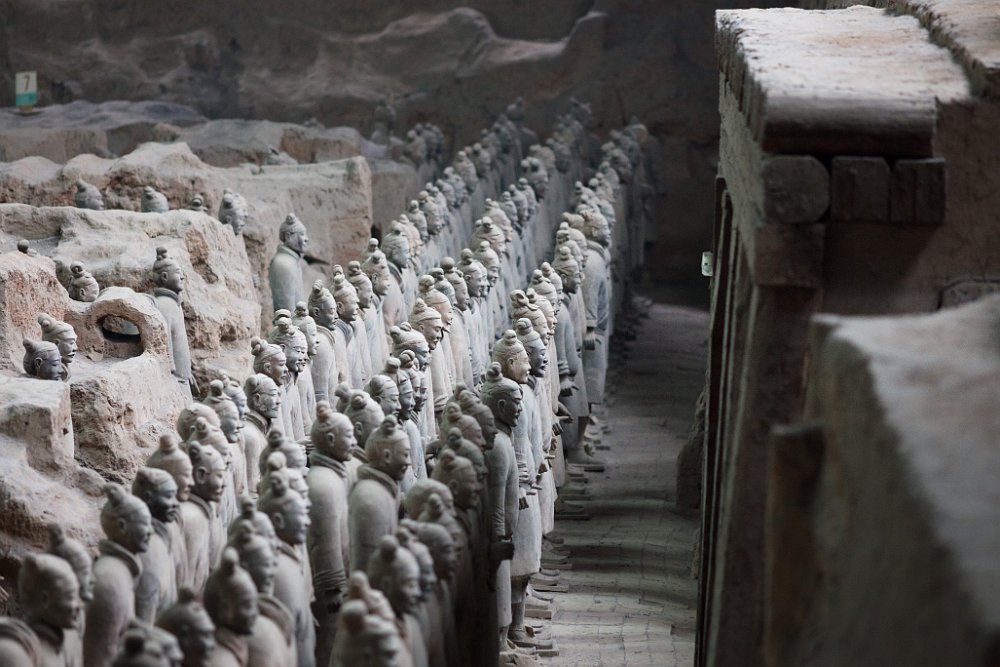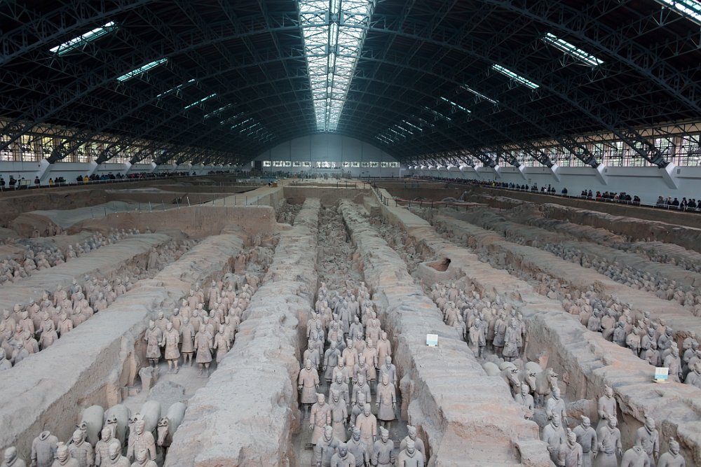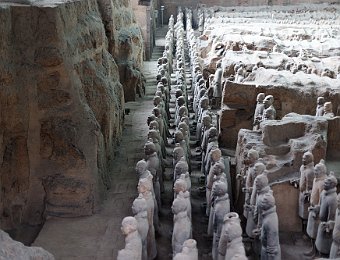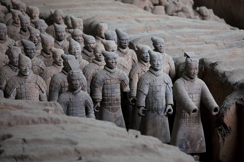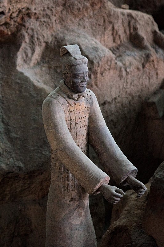 Pit 1 - 11 parallel pits running east to west containing an estimated 8000 terracotta figuresThe terracotta army lined up in military position in Pit 1Terracotta warriors and horseLight infantrymen in Pit 1Armoured terracotta warriors lined up in military formationThree rows of unarmoured infantry at the frontAnother view of the front rowsChariot driverAn armoured infantrymanArmoured infantrymen Shaanxi history museum