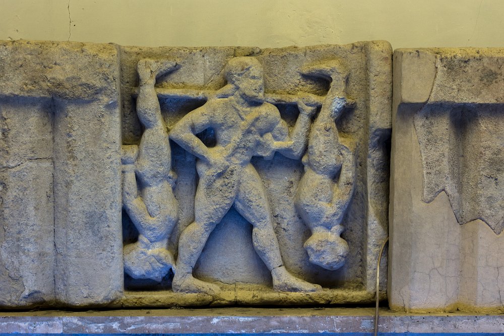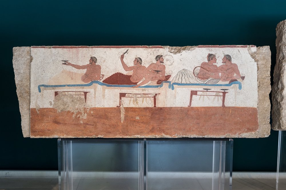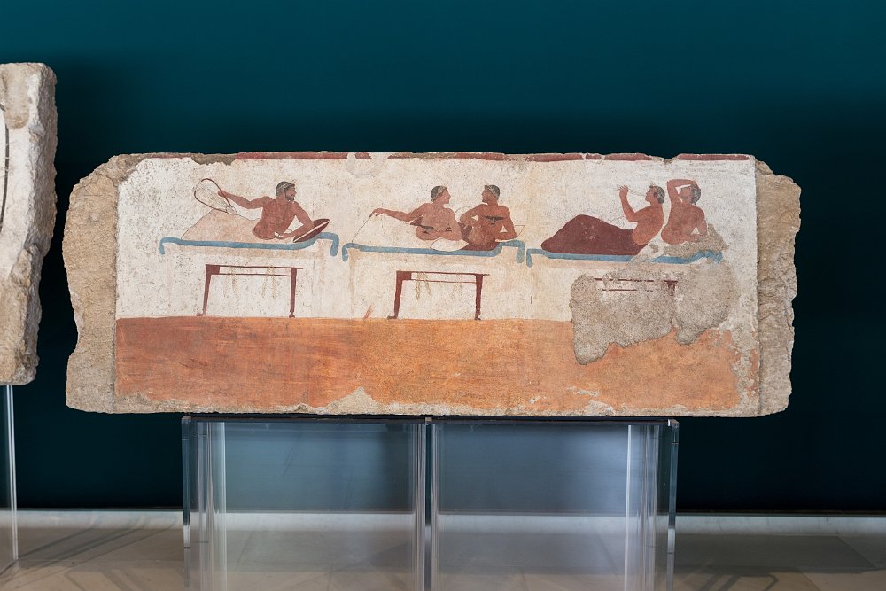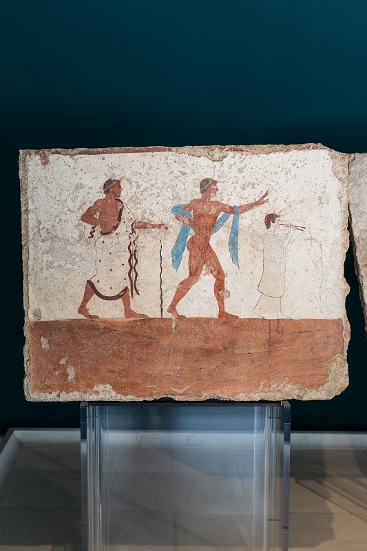 The Sele metopes as displayed in the Paestum museumThe Sele metopes as displayed in the Paestum museumThe Sele metopes as displayed in the Paestum museumFresco paintings of the Tomb of the DiverThe ceiling of the Tomb of the DiverFresco painting from the lateral wall of the Tomb of the DiverFresco painting from lateral walls of the Tomb of the Diver depicting a symposium sceneFresco painting from the lateral wall of the Tomb of the DiverDetail of fresco from west walls of the Tomb of the Diver depicting a a cortege of guestsLucanian fresco tomb painting of a rooster Naples - Archaeological Museum 2015 JulPompeii 2015 Jul