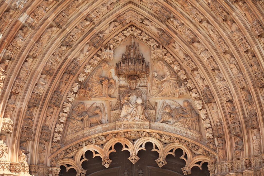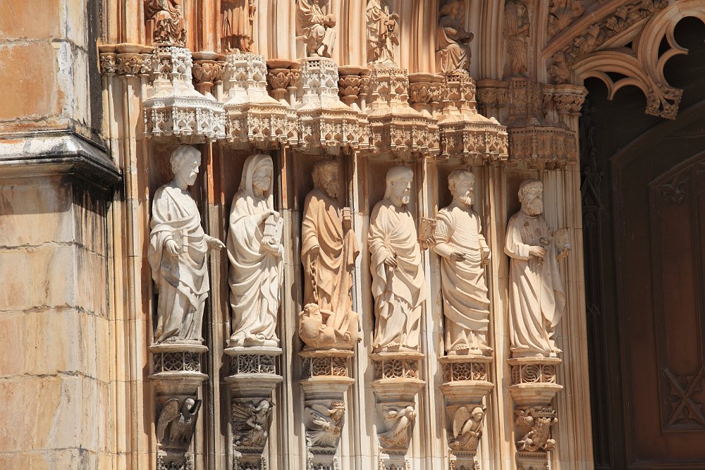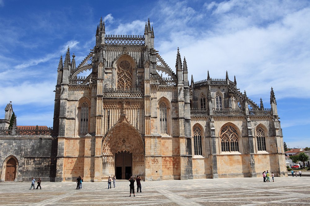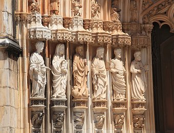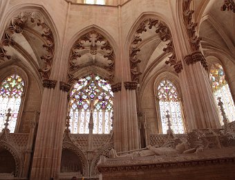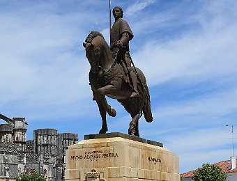 Lateral view of the MonasteryStatue of Nuno Álvares PereiraThe main façade of the MonasteryTympanum and archivolts of the church's main doorCarved figures of the main portalGothic spires of the ChurchTop of the Founder's ChapelFounder's ChapelCeiling of the Founder's ChapelTomb of King João I Mosteiro de Alcobaça 2009 AugFátima 2009 Aug