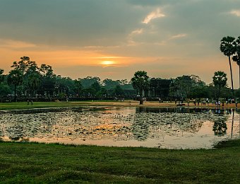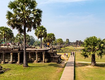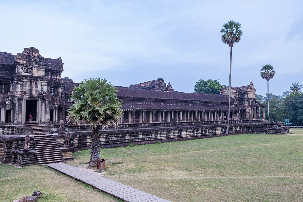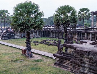 Sandstone causeway across the moat leading to the west Gopura of the outer (fourth) enclosureThe fourth enclosure and steps leading down to the moatAngkor Wat at dawnPart of the cruciform terrace at the end of the west raised walkwayAnother view of the cruciform terrace with the guarding lions and naga balustradesThe five prasats and reflection on the Southern poolThe five prasats are designed to symbolise Mount Meru (a golden mountain that stands in the centre of the universe in Hindu mythology)The tall molded base of the outer enclosure wall is guarded by 2m tall lion statuesThe third gallery, which surrounds the first of the three levels on which Angkor Wat standsThe third gallery of the temple complex Angkor ThomBanteay Kdei