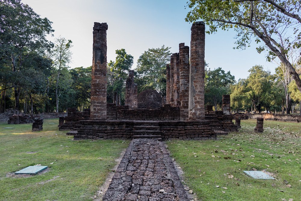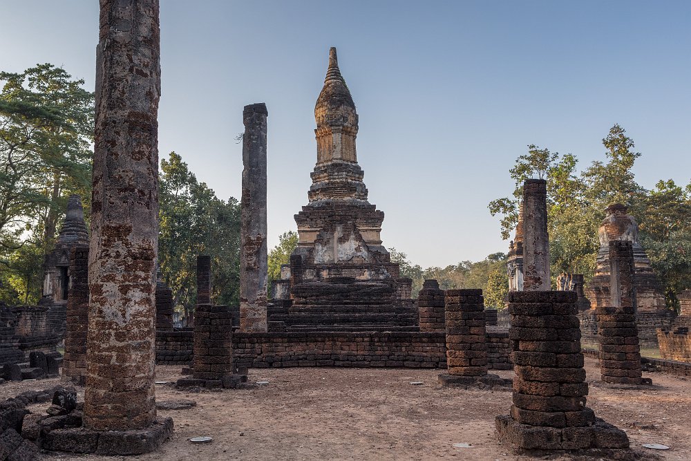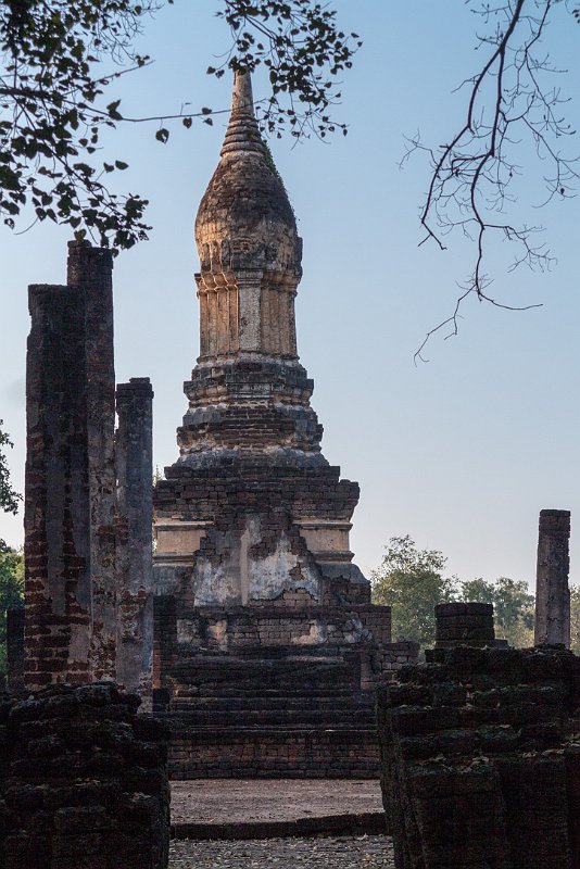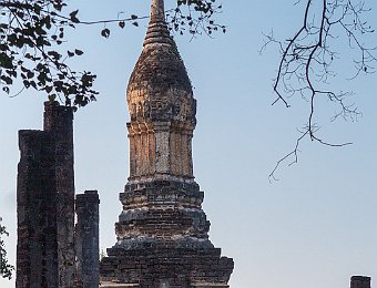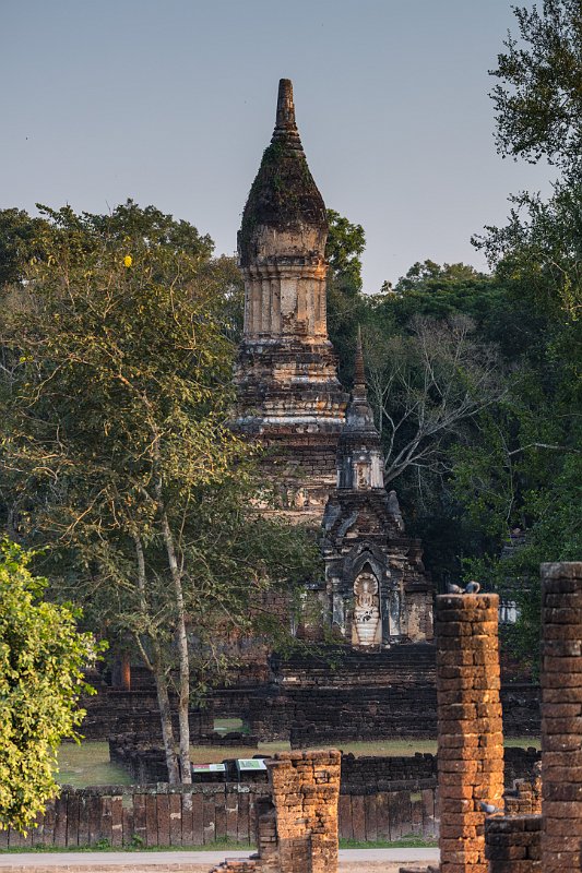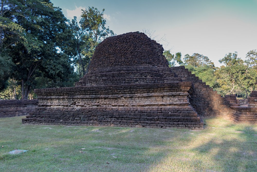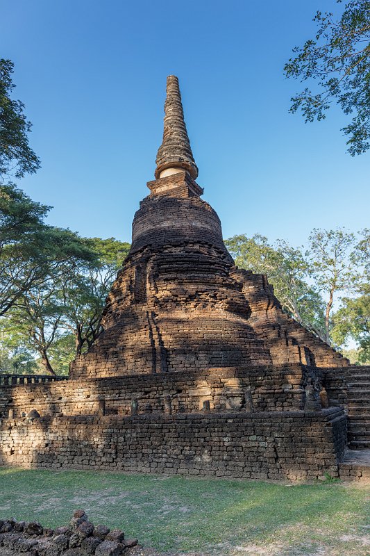 The lotus-bud chedi stands atop of a tall pyramidal base which is a common Sukhothai design feature